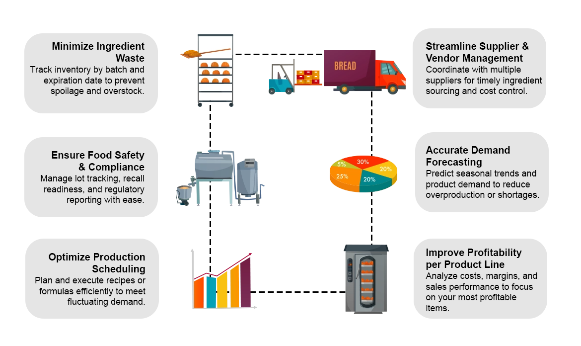 Track ingredients from supplier to customer, manage recalls quickly, and stay compliant with food safety regulations and quality standards.